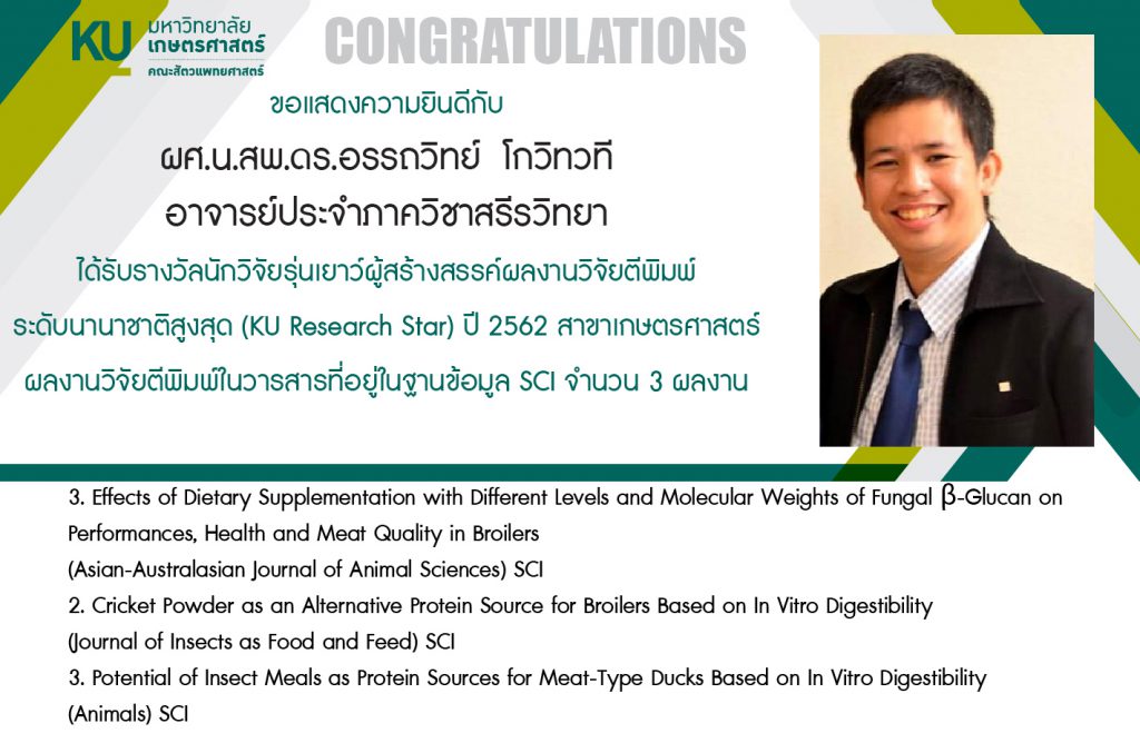 ที่ได้รับรางวัลนักวิจัยรุ่นเยาว์ผู้สร้างสรรค์ผลงานวิจัยตีพิมพ์ระดับนานาชาติสูงสุด (KU Research Star) ปี 2562 สาขาเกษตรศาสตร์