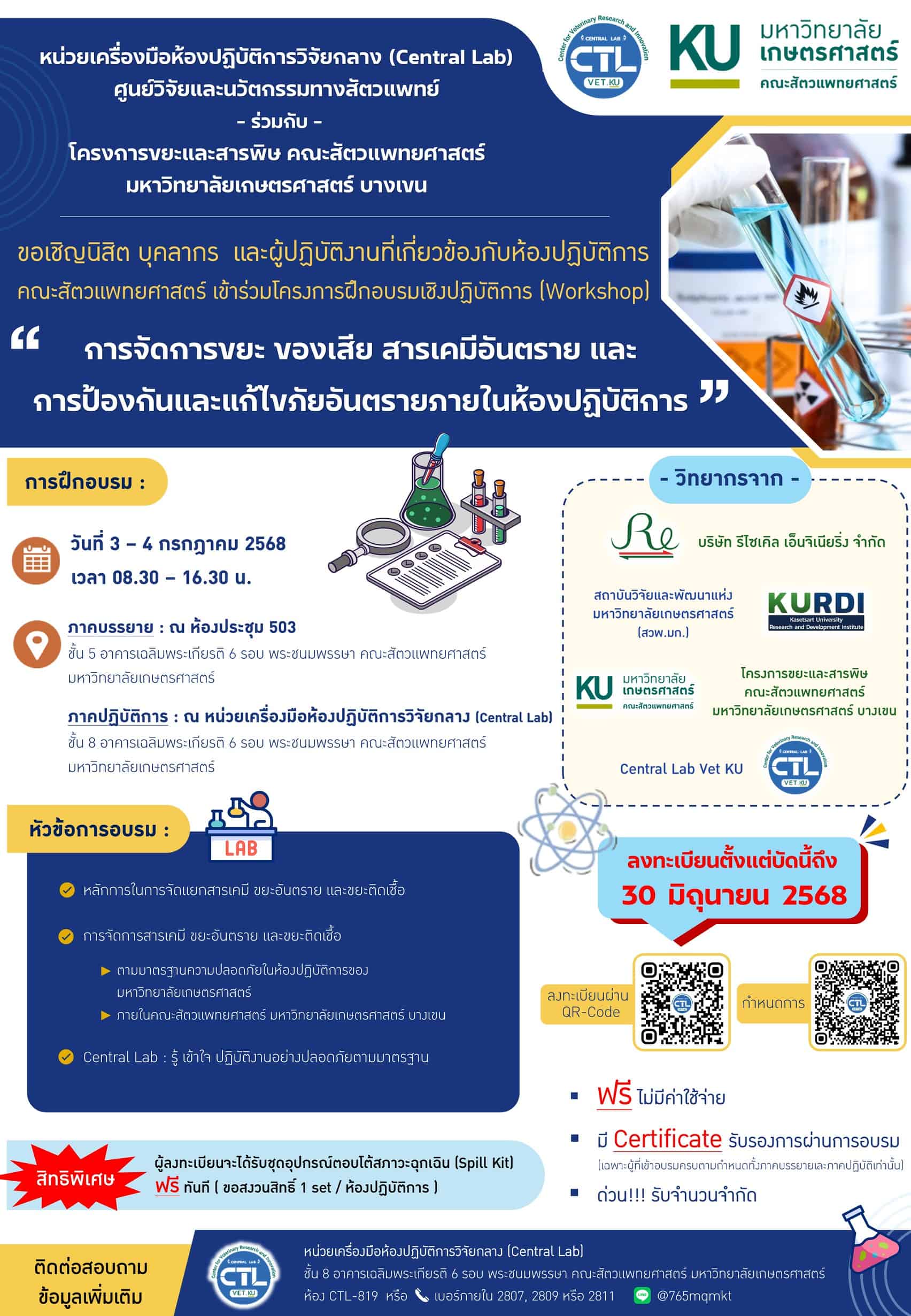 ขอเชิญนิสิต บุคลากร และผู้ปฏิบัติงานที่เกี่ยวข้องกับห้องปฏิบัติการ คณะสัตวแพทยศาสตร์ เข้าร่วมโครงการฝึกอบรมเชิงปฏิบัติการ (Workshop)