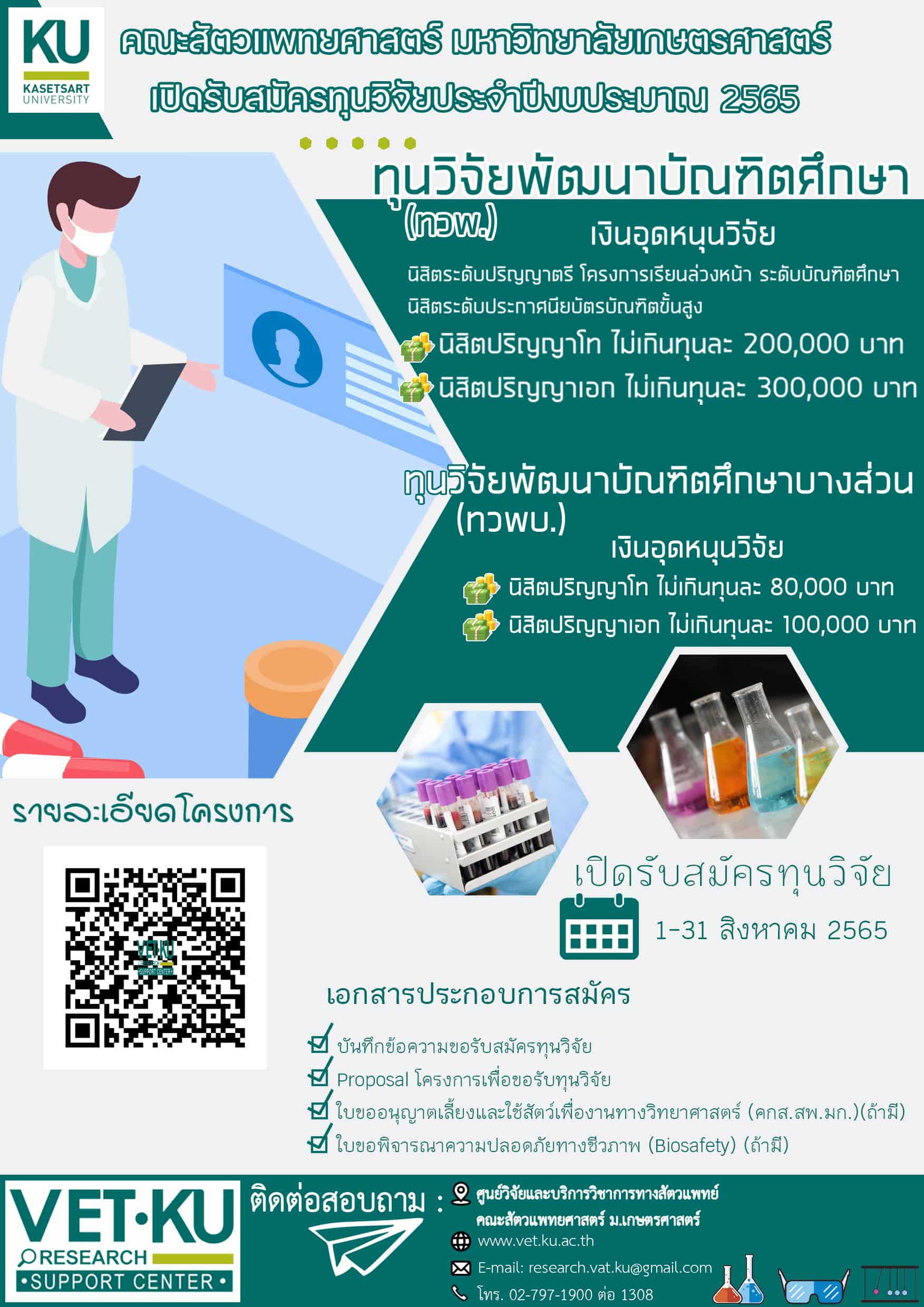 ที่มีคุณภาพ คณะสัตวแพทยศาสตร์จึงได้เปิดรับสมัครทุนวิจัยประจำปีงบประมาณ 2565 ดังนี้