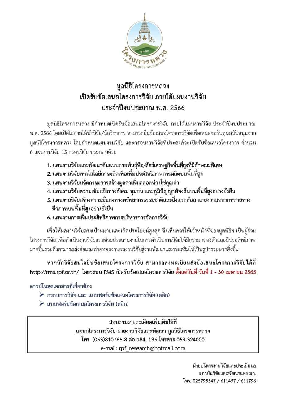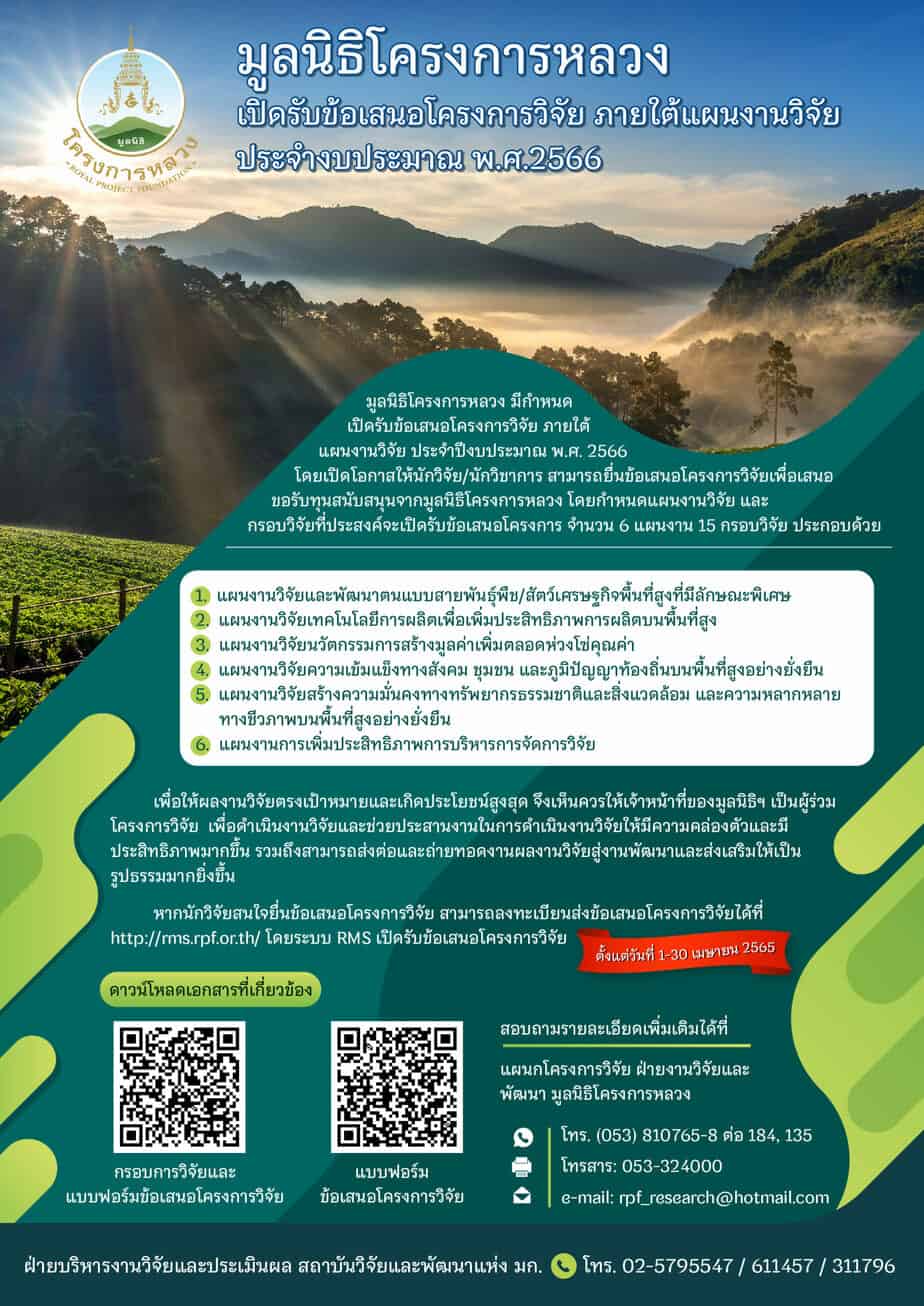 มูลนิธิโครงการหลวง มีกำหนดเปิดรับข้อเสนอโครกงารวิจัย ภายใต้แผนงานวิจัย ประจำปีงบประมาณ พ.ศ. 2566 โดยเปิดโอกาสให้นักวิจัย/นักวิชาการ สามารถยื่นข้อเสนอโครงการวิจัยเพื่อเสนอขอรับทุนสนับสนุนจากมูลนิธิโครงการหลวง โดยกำหนดแผนงานวิจัย และกรอบงานวิจัยที่ประสงค์จะเปิดรับข้อเสนอโครงการ จำนวน 6 แผนงานวิจัย 15 กรอบวิจัย ประกอบด้วย