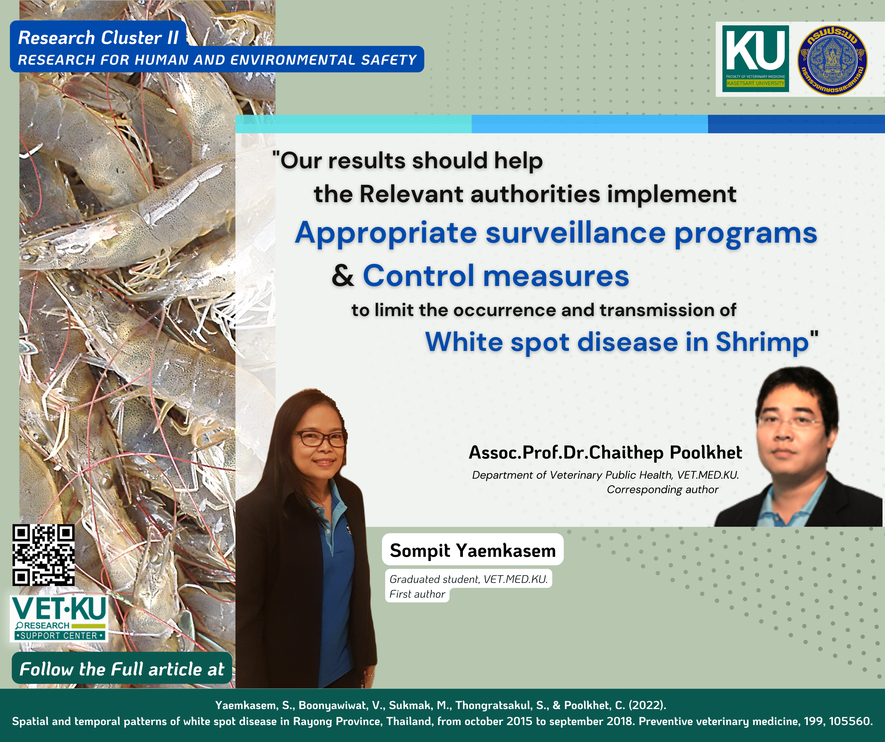 - Yaemkasem, S., Boonyawiwat, V., Sukmak, M., Thongratsakul, S., & Poolkhet, C. (2022). Spatial and temporal patterns of white spot disease in Rayong Province, Thailand, from october 2015 to september 2018. Preventive Veterinary Medicine, 199, 105560.